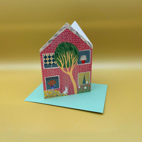 A little double sided collage of a sweet red-brick house with a kissing couple in one window and a happy cat in another.
