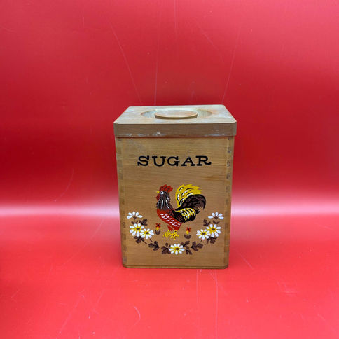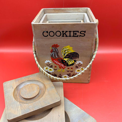 A charming set of mid-century wooden kitchen canisters, beautifully crafted with dovetail joints and a nesting design. These folk-art style boxes feature colourful hand-painted motifs of roosters, florals, and trees — a joyful nod to Alsace or Central European decorative traditions.